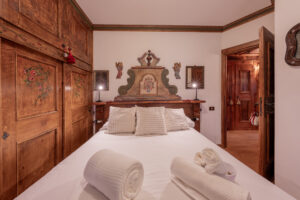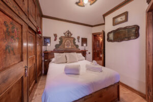 – Una camera matrimoniale con letto queen-size, arredata in stile montano caldo ed essenziale.